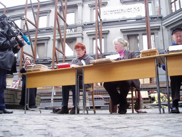 Det er ikkje tilfeldig at vi er samla her midt mellom Aschehoug og det som no er igjen av Gyldendal Norsk Forlag. Inne der skal det kome eit nytt kontorbygg til 700 millioner kroner. Norske omsettarar unner Gyldendal det nye bygget av eit godt hjarte – men vi vil gjerne at forlaget sluttar med å be norske omsettarar om å subsidiere bygget med arbeidet vårt, for det har vi rett og slett ikkje råd til lenger.
